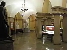 The United States Capitol crypt is the large circular room filled with forty neoclassical Doric columns directly beneath the United States Capitol rotunda. It was built originally to support the rotunda as well as offer an entrance to Washington's Tomb. It currently serves as a museum and a repository for thirteen statues of the National Statuary Hall Collection.