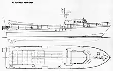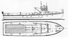 These vessels were built by Sewart Seacraft.[41] They were a derivative of an oilfield services crew boat which Sewart sold to support offshore oil installations in the Gulf of Mexico.[42] They were constructed of welded aluminum plates. They were 85 feet (26 m) long, with a beam of 18.7 feet (5.7 m), and a draft of 5.67 feet (1.73 m). They displaced 61 tons at full load. They could reach a speed of 21 knots. They had two propellers driven by two General Motors 16V-71 Diesel engines that produced 1,160 horsepower.[16] They had deck space to recover as many as eight torpedoes. These boats sailed with a crew of five men.[7] Although their hull registration numbers remained in the torpedo retriever sequence, they were referred to as "weapon retriever boats" at the Pacific Missile Range Facility where two were based.