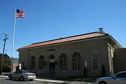 Naugatuck's former main post office is located north of the town green, at the southeast corner of Church and Cedar Streets. It is a single-story masonry structure, its original main block finished in buff brick trimmed with terra cotta and marble, and covered by a hipped red tile roof. A later 20th-century addition extends to its rear; it has a frame of steel and concrete, but is finished with similar materials and covered by a flat roof. The main facade is dominated by five large round-arch openings, with the four outer ones housing windows that flank the main entrance in the center bay. A frieze dotted with terra cotta and marble inlays extends below the bracketed cornice.[2]