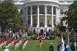 • Following ruffles and flourishes a pause is observed to allow the announcement of the dignitary. The appropriate entrance march is then performed: "Hail to the Chief" (the President of the United States), "Hail Columbia" (the Vice President), the "General's March" (Army and Air Force generals), or the "Flag Officer's March" (admirals). The last 32 bars of "Stars and Stripes Forever" are performed as a generic entrance march for civilian officials below the rank of Vice President. If the official is a foreign dignitary, the last 16 bars of "Hands Across the Sea" is used instead.