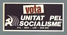 Unity for Socialism (Catalan: Unitat pel Socialisme) was an electoral coalition in Catalonia, Spain, contesting the 1980 Catalan parliament election. The coalition represented the main groups of the non-parliamentary left in Catalonia at the time.[1] It was constituted by the Workers Party of Catalonia (PTC), Communist Organization of Spain (Bandera Roja) (OCE(BR)), Revolutionary Communist League (LCR) and the Communist Movement of Catalonia (MCC).[2] Manuel Gracia Luño (general secretary of PTC) was the top candidate in the Barcelona constituency, whilst Jordi Creixans (OCE(BR)) headed the Girona list, Francisco Javier Clavería (PTC) headed the Lleida list and José Semente Moya (MCC) was the top candidate in Tarragona.[3][4]