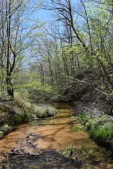 The UMFS is within the designated borders of Holly Springs National Forest, although none of the directly adjoining land is managed or owned by the U.S. Forest Service.[4] The soils at the field station are primarily sandy and sandy-loam soils.[1] The soils were originally primarily loess but were severely degraded from forest clearing and poor agricultural practices that occurred after European settlement in 1832.[5] There are several springs in the area that provide a year-round supply of water to the field station's streams and ponds.[2]:3 Elevations range from just under 400 feet (120 m) above sea level along the lower section of Bay Springs Branch to over 540 feet (160 m) on the northern edge of the field station.[4]