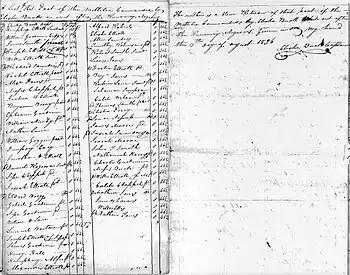 1826 North Carolina militia roster of 86 men, standard wage of 46+12 cents per day. Text reads: "A List of that Part of the Millitia Commanded by Elisha Burk an went after the Runaway Negroes. ... The within is a True Return of that part of the Millitia Commanded by Elisha Burk While out after the Runaway Negroes: Given under my hand this 15th day of August 1826". (signed) Elisha Burk Captain.