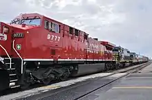 Four GE AC4400CWs leased from CP were used to depict the locomotives used on the runaway train, 777 and trailing unit 767. CP 9777 and 9758 played 777 and 767 in early scenes, and CP 9782 and 9751 were given a damaged look for later scenes.[31] These four locomotives were repainted to standard colors in early 2010 by Canadian Pacific following the filming, but the black and yellow warning stripes from the AWVR livery painted on the plows of each locomotive were left untouched (except for 9777's plow) and remained visible on the locomotives.[32][33]