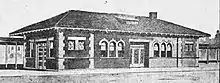 The grade crossing elimination was completed in 1908.[17] It cost $500,000 (equivalent to $11,500,000 in 2022) and modified the grade of the tracks for nearly a mile from Massachusetts Avenue to Bird Street.[13] The new stone station opened on April 14, 1909 at a cost of $18,000 (equivalent to $415,000 in 2022), then serving 65 trains per day. Located on the east side of the tracks, it was 72 by 27 feet (21.9 m × 8.2 m) in size with a 45-by-25-foot (13.7 m × 7.6 m) waiting room, a ticket and telegraph office, and a baggage room. It was made of red brick with a concrete foundation, brownstone base, and limestone trim.[17] A pedestrian tunnel under the tracks connected the platforms.[18][19]
