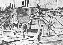 Elimination of the busy Dudley Street grade crossing was long desired, but proved difficult because changing the grade of Dudley Street required modifying several nearby cross streets and numerous buildings.[10] Construction to raise the tracks and lower Dudley Street began around September 1906.[11] A temporary streetcar bypass track, railroad trestle, and station opened in January 1907.[12][13] The railroad initially intended to continue using the 54-year-old wooden station building, which was insufficient to handle the 2,700 daily passengers at the station.[14][15] After a May 1907 hearing, the railroad agreed to build a new stone station.[15][16]
