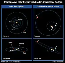 The orbital parameters of this three-planet system have been fully determined. The system is not coplanar, with each other or with the stellar rotation, as in our Solar System.[7] Simulations shows that the measured configuration of the planets produces indeed stable orbits for at least 100 million years, where planets b and d remain roughly coplanar. General relativity is expected to have strong effects on planet b, because it orbits at a distance of just ~0.05 AU from the parent star. The apsides of planet c and d, instead, oscillates with time;[28] the orbit of Upsilon Andromedae c thus returns to a nearly circular state every 9,000 years. The eccentricity of those planets may have arisen from a close encounter between the outer planet and a fourth planet, with the result that the third planet was ejected from the system or destroyed.[35] Such a mechanism could have been triggered by perturbations on the orbit of the companion star, which arise from close encounters with other stars and from the tidal field of the Milky Way.[36] The orbits of the two inner planets seems to be shaped by tidal interactions, while the evolution of c and d orbits is secular.[37]