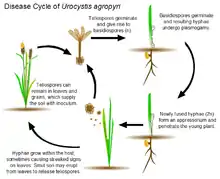 U. agropyri produces teliospores, which may be wind dispersed or distributed through soils via machinery or animals. In soil, a dikaryotic teliospore germinates, meiosis occurs, then mitosis, and this gives rise to up to four basidiospores, each containing a single nucleus.[7] Basidiospores germinate on seedlings, and each hypha undergoes plasmogamy with a compatible hypha. In this, one nucleus transfers to the other hypha, reestablishing the dikaryotic state of the fungus.[7] The hyphae form appressoria which penetrate the coleoptile of an emerging seeds' shoot through the epidermal tissue, then hyphae grow between vascular bundles of the leaves.[6][7] Some hyphal cells give rise to smut sori, bearing teliospores, which emerge through the leaf tissue for wind dispersal.[6] Teliospores come to rest in soils, and when conditions are right, they give rise to more basidiospores, further spreading the infection. Alternatively, teliospores can form in seeds when the mycelia grows throughout the plant, in which case they germinate within the seed to give rise to new infection, again via basidiospore production.[8] Teliospores overwinter in the soil, senescent plant tissues, and in seeds. These spores maintain germination viability for 3–7 years.[6]