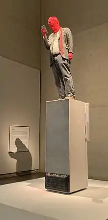 Francesco 2017 depicts Bonami atop an open refrigerator stacked with fruit and vegetables. The refrigerator acts as a plinth, a satire of sculpture’s elevation of important men on marble plinths. The figure stares at his smartphone, in a position “emblematic of our era”.[6] The melting wax and fruit and vegetables in the fridge are a reference to memento mori of seventeenth-century Dutch painting, where motifs such as food, candles, hourglasses and skulls are utilised as a reminder of mortality.[38] The artist sets no strict parameters for the burning of the sculpture. Wicks are inserted at various locations on the work; all the wicks can be lit at once to accelerate the process or the life of the work can be extended by limiting the number of wicks lit at once. The work can be lit continuously or sporadically. Once the figure has melted completely, the remains will be returned to the Swiss foundry where it was made to be recast and returned to the museum for the next installation.[8]