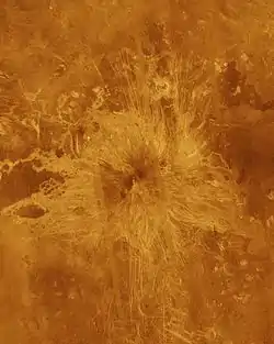 Ushas Mons is a 2-kilometer-high (1.25 mile) volcano[1] in the southern hemisphere of Venus at 25 degrees south latitude, 323 degrees east longitude. Its name is derived from Vedic goddess of dawn Ushas. The volcano is marked by numerous bright lava flows and a set of north-south trending fractures, many of which appear to have formed after the lavas were erupted onto the surface. In the central summit area, however, younger flows remain unfractured. An impact crater can be seen among the fractures in the upper center of the image. The association of faulting and volcanism is common on this type of volcano on Venus, and is believed to result from a large zone of hot material upwelling from the Venusian mantle, a phenomenon known on Earth as a "hotspot."