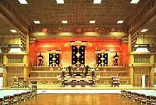 The service takes place in the second floor of the Kyakuden building where they face the Ozagawari "Joza" Gohonzon transcribed by Nikkō Shōnin in honor of the peasant martyr Jinshiro, dating from 8 April 1308, along with grand wooden statues of Nichiren and his secretary Nikkō Shōnin which represents the three jewels of Buddhism as taught by the sect. This particular Gohonzon commemorates the fourteen years of passing by the persecution of Hokkeko believers by the mercenary Hei No Saimon Yoritsuna, who persecuted Nichiren's peasant disciples in the Atsuhara region in the year 1279.[6]