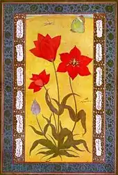 Mansur painted at least one hundred flowers from the Kashmir valley during this period.[5] A red tulip from Kashmir is a better-known painting. The identity of the tulip is however debated with competing suggestions that include Tulipa lanata, T. montana and T. lehmanniana.[6] In 1621, Jehangir was gifted a zebra and this was perhaps the subject of the last miniature painting made by Mansur. It is suggested that his career ended with the reign of Jehangir in 1627.[7] Several other signed works, such as one of the Siberian crane (now no longer a winter migrant to India) and the other of a Bengal florican are in the Indian Museum, Kolkata. Some other works are in the National Museum, Delhi, the Maharaja Sawai Man Singh II Museum, Jaipur and the Chhatrapati Sivaji Vastu Sangrahalaya, Mumbai.[8]