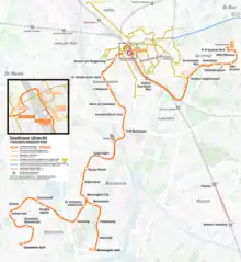 The Utrechtse sneltram travels via Utrecht Centraal station (abbreviated as Utrecht CS) between the Uithof district southeast of the station to Nieuwegein and IJsselstein southwest of the station.[3]