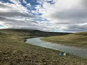 The Utukok River (Iñupiaq: Utuqqaq) is a 225-mile (362 km) long stream in the North Slope Borough of the U.S. state of Alaska.[3] It rises in the De Long Mountains at the confluence of Kogruk and Tupik creeks and flows north, northeast, and then northwest.[2] It empties into Kasegaluk Lagoon on the Chukchi Sea of the Arctic Ocean, 20 miles (32 km) southwest of Icy Cape.[2] It is the breeding ground for Arctic caribou and various birds.[4]