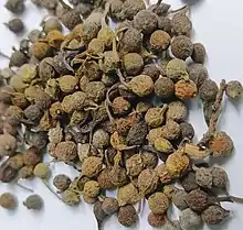 Piper guineense is a West African species of Piper; the spice derived from its dried fruit is known as Ashanti pepper, Benin pepper, Edo pepper, false cubeb, Guinea cubeb, and called locally kale, kukauabe, masoro, etiñkeni, sasema, soro wisa, eyendo, eshasha by the Urhobo people, and oziza and uziza by the Igbo people of Nigeria. It is a close relative of cubeb pepper and a relative of black pepper and long pepper. Unlike cubeb, which is large and spherical in shape, Ashanti pepper grains are prolate spheroids, smaller and smoother than Cubeb pepper in appearance and generally bear a reddish tinge.[1] The stalks of Ashanti pepper berries are also distinctly curved whilst those of cubeb pepper are completely straight.[1] The terms West African pepper and Guinea pepper have also been used, but are ambiguous and may refer to grains of Selim or grains of paradise.