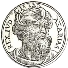 Uzziah (/əˈzaɪə/; Hebrew: עֻזִּיָּהוּ ‘Uzzīyyāhū, meaning "my strength is Yah";[1] Greek: Ὀζίας; Latin: Ozias), also known as Azariah (/ˈæzəˈraɪə/; Hebrew: עֲזַרְיָה ‘Azaryā; Greek: Αζαρίας; Latin: Azarias), was the tenth king of the ancient Kingdom of Judah, and one of Amaziah's sons. (2 Chronicles 26:1) Uzziah was 16 when he became king of Judah and reigned for 52 years. The first 24 years of his reign were as a co-regent with his father, Amaziah.