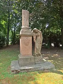 In 1836 Frierenberger's widow had a monument built on her husband's grave. In 1936, the memorial was relocated to the current town cemetery entrance (49°17′14″N 17°23′16″E / 49.2873333°N 17.3878333°E / 49.2873333; 17.3878333). The memorial in the Empire style is on the list of Cultural Monuments of the Czech Republic under the item number 101308.[8] The statue represents a grieving woman leaning on a pedestal which is carrying a broken Doric column. There are German inscriptions on all four sides of the pedestal shaft honoring the general.