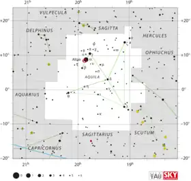 V500 Aquilae also known as Nova Aquilae 1943 was a nova which appeared in the constellation Aquila, very near the star Altair, in 1943. It was discovered by Cuno Hoffmeister on photographic plates taken at Sonneberg Observatory on 5 September 1943, when it had a photographic magnitude of 12.[4] It reached its peak brightness sometime between 13 April 1943 when it was fainter than photographic magnitude 13.5, and 2 May 1943 when its photographic magnitude was 6.55 (6.1 visual magnitude).[2]