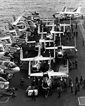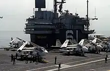 In February 2003 the squadron began pre-deployment workups, completing TSTA III and COMTUEX in September 2003 and began deployment on 3 October 2003 with CVW-1 on board USS Enterprise. In early December 2003 the squadron were notified during a port call in Dubai, United Arab Emirates, that a detachment from the squadron was needed in Bagram Airfield Afghanistan. Less than 48 hours after official notification arrived, the squadron offloaded and transported approximately 17,000 pounds of cargo and more than 30 people to Bagram, and set up spaces to catch the inbound aircraft from the ship, becoming the first EA-6B Prowler squadron to be forward deployed to the base.[5] In January 2004 the squadron was relieved by EA-6Bs from VAQ-142 and redeployed to USS Enterprise to complete their deployment.
