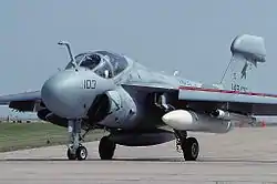 During its last dozen years, VAQ-33 continued a high tempo of operations supporting the fleet. It was one of the few U.S. Navy Squadrons to utilize 'autonomous maintenance units’ or ‘AMU’s. The AMU’s performed as specific type squadrons within the main squadron. AMU-1 performed maintenance on the A-3 Skywarriors (known as ‘Whales’). Between 1988 and until the retirement of the Whale, VAQ-33 became a clearing house for some A-3 aircraft to be evaluated prior to dispensation to Davis Mothan AFB or Museum. AMU-2 performed maintenance on the EA-6A and EA-6A Recap Electric Intruders. AMU-3 would perform maintenance on A-1 Sky Raiders, to be replaced by A-4 Sky Hawks, which was replaced by TA-7C and TA-7Z Corsair II aircraft. The TA-7Z Corsair II was an in-house avionics and airframe modification to support the squadrons electronic warfare mission, being capable of carrying a suite of electronic warfare pods. AMU-4 performed maintenance on P-3 Orion aircraft of several variants from P-3 (airframe #3) to P-3B which would go through Depot Level maintenance to convert it to the EP-3J being specifically made to support the squadron's mission. AMU-5 performed maintenance on F-4 Phantom II aircraft. AMU-6 performed intermediate level maintenance on the electronic warfare pods the aircraft carried. [2] The EA-6A became its only jet aircraft, while it retained three turboprop P-3 Orions. The squadron's success in its mission was shown by the establishment in 1983 of VAQ-34 at NAS Point Mugu and in 1991 of VAQ-35 at NAS Whidbey Island. Its role as an A-3 FRS ended with the retirement of the Whale in 1991. The electronic aggressor mission was eventually transferred to the Navy Reserve. The 2 EP-3J Orions were transferred to a Navy Reserve Squadron (Patrol Squadron 66 (VP-66)) to continue performing the electronic warfare aggressor missions. That was a new mission for VP-66 and the squadron's manning was increased in order to accomplish the new mission in addition to all the squadron's other missions.[3] VAQ-33 finally wound down operations during 1993. In keeping with its "last to fly this airplane" tradition, its EA-6As were the last of their kind retired from service. The squadron was disestablished on 1 October 1993.[1]