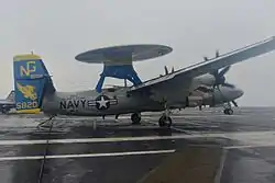 In May 1970, the squadron was temporarily disestablished and placed in "stand down" status until reactivated on 3 July 1973. The squadron, now flying E-2Bs, were assigned to Carrier Air Wing 2 (CVW-2) and made three Western Pacific/Indian Ocean deployments on board USS Ranger, before assignment to Carrier Air Wing 8 (CVW-8) aboard USS Nimitz, for a Mediterranean and Indian Ocean deployment.[1]