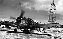 The squadron arrived at Naval Advance Base Espiritu Santo on May 4, 1944, and flew into Luganville Airfield the next day joining Marine Aircraft Group 21.[2] It remained there for nearly a month before the flight echelon departed on June 2, 1944, on the USS Santee (CVE-29).[2] The squadron's ground personnel were split between the USS Cetus (AK-77), SS Typhoon, and the SS Young.[2] After 65 days at sea, VMF(N)-534's, as part of Marine Aircraft Group 21, took off from the USS Santee, becoming the first aviation unit to land on Guam as they touched down on Orote Field on August 4, 1944.[6] The first combat air patrols commenced on August 7, 1944.[4] That same evening VMF(N)-534 also conducted its first night raids when a section of aircraft strafed the Japanese garrison on Rota. Between August 7 and December 29 the squadron conducted a total of eight strafing/bombing missions against Rota Island.[2] While on Guam squadron personnel conducted numerous patrols and assisted in burying Japanese war dead. From August 4 through December 31, VMF(N)-534 flew 1402 sorties totaling 2,610.6 hours of flying conducting nighttime CAP, strafing and bombing, and search missions. Test flight, fighter cover and ferrying missions accounted for another 491.6 hours.
