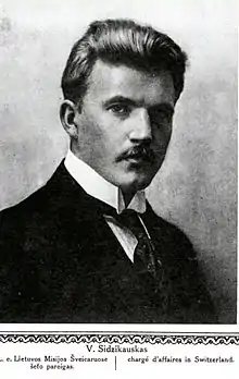 In October 1919, Sidzikauskas returned to Switzerland in hopes of completing his studies at the University of Fribourg while working at the Lithuanian mission in Switzerland. He became the first secretary to Jurgis Šaulys.[6] However, just five weeks later, Šaulys resigned due to a conflict with Prime Minister Augustinas Voldemaras over four Lithuanian organizations that were closed.[10] Thus young and inexperienced Sidzikauskas became the Lithuanian representative in Switzerland on 6 December 1919.[11] On 12 December Sidzikauskas visited Swiss Federal Department of Foreign Affairs regarding the recognition of Lithuanian passports. The next day, he received a response that the existing status quo was equivalent to Swiss recognition of Lithuania de facto.[10] In May 1920, after the first session of the Constituent Assembly of Lithuania, Sidzikauskas visited Giuseppe Motta regarding de facto recognition of Lithuania which was granted on July 19 along with a promise to support Lithuania's membership in the League of Nations.[10] Switzerland became one of the first countries to recognize Lithuania de jure.[12] Lithuania became a full member of the League of Nations on 21 September 1921.[12]