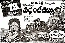 Vaddante Dabbu (transl.Endless Money)[1] is a 1954 Indian Telugu-language screwball comedy film directed by Y. R. Swamy.[2] It was produced by Moola Narayana Swamy and presented by H. M. Reddy on Rohini Pictures banner. The film stars N. T. Rama Rao, Sowcar Janaki and Jamuna, with music composed by T. A. Kalyanam. It is based on the George Barr McCutcheon novel Brewster's Millions (1902). Despite originally opening to a mixed response, it attained cult status in Telugu cinema, and was remade in the same language as Babai Abbai (1985).