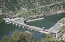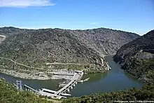 ![]() Valeira Dam downstream of the curve that follows the exceptionally tight gorge of the Douro River, known as Cachão da Valeira | |