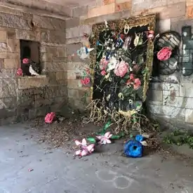 Critics described the "Altered States" exhibition as a faux-Colonial memento mori suggesting a mansion ravaged by fire and floods and reclaimed by the elements, which also pointed to deep fissures in American culture.[39][40][36] Its individual works included: the sandy, emaciated Shipwrecked Armoire with Barnacles; Headless George Washington with Table (Lansdowne Portrait), a horrific reimagining of the Stuart portrait, torn asunder and scorched, with its partially melted head sliding onto the gallery floor like a shriveled mask; and Rug with Grass, a shredded, rotted Empire style carpet sprouting reeds and aquatic plants that indicated the potential of growth out of decay.[36][40][39][7] Hegarty's exhibition "Alternative Histories," (Brooklyn Museum, 2013) explored similar themes—colonization, Manifest Destiny, repressed history, mortality—with sculptural interventions in the museum's decorated, period rooms that included a flock of attacking crows, dissolving portraits, vanitas-influenced still lifes and rugs overgrown with vegetation.[41][12][42]