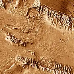 Further to the east from Oudemans, Ius and Tithonium chasmata are located parallel to each other, Ius to the south and Tithonium to the north. Ius is the wider of the two, leading to Melas Chasma. Ius has a ridge down the center of it by the name of Geryon Montes, composed of the undivided basement rock. The floor of Ius Chasma is mostly composed of pristine landslide material, not much degraded by cratering or erosion. The southern wall of Ius, and to a lesser extent the northern wall, has many short valleys stretching off roughly perpendicular to the line of the chasmas. These valleys have a stubby theater-headed leading edge very much like features seen on the Colorado Plateau near the Grand Canyon that appear from groundwater sapping. (Theater-headed means that, from above, the head of the valley is a well-defined U-shape). The valley is propagated by the continued erosion and the collapse of the wall.[14] Tithonium Chasma is very similar to Ius, except it is lacking the sapping features on the south side and contains a small portion of material that is similar to the smooth floor features except that it appears to be an ash fall that has been eroded by the wind. Between the two canyons, the surface is composed of younger fractured material - lava flows and faults from crustal extension of the Tharsis Bulge.[12]