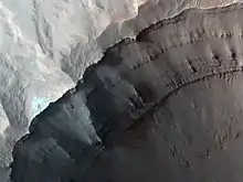 Rim of Ganges chasma, closeup showing stratigraphy and small landslides.