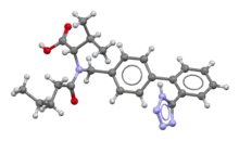 Valsartan blocks the actions of angiotensin II, which include constricting blood vessels and activating aldosterone, to reduce blood pressure.[32] The drug binds to angiotensin type I receptors (AT1), working as an antagonist.[33] This mechanism of action is different than that of the ACE inhibitor drugs, which block the conversion of angiotensin I to angiotensin II. As valsartan acts at the receptor, it can provide more complete angiotensin II antagonism since angiotensin II is generated by other enzymes as well as ACE. Also, valsartan does not affect the metabolism of bradykinin like ACE inhibitors do.[32]