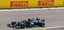 At the Azerbaijan Grand Prix, he qualified in 10th place, after a red flag prevented him and other drivers from setting a second flying lap in the third and final session, and was unable to make up positions in the race, eventually finishing 12th, ahead of only the Haas cars, Nicholas Latifi and his teammate Hamilton, who had made a mistake on lap 50.[118] At the French Grand Prix, Bottas qualified in 3rd place behind teammate Hamilton and Verstappen. In the final stages of the race, he struggled with tyre wear as he had to pit early to undercut Verstappen. He was eventually passed by Verstappen and Pérez, leaving Bottas furious with the one-stop strategy implemented by Mercedes as he finished the race in fourth.[119] In the Styrian Grand Prix, Bottas qualified 2nd ahead of Hamilton but was demoted to fifth due to a penalty for dangerously spinning in the pitlane in FP2. During the race, he overtook the McLaren of Lando Norris using DRS and undercut Pérez during the pitstop phase, and despite coming under pressure from the two-stopping Red Bull at the end of the race, finished 3rd, his first podium since Spain.[120] In the Austrian Grand Prix, he qualified 5th directly behind Hamilton. During the race, several close battles resulted in cars being forced off-track and drivers receiving time penalties. Hamilton suffered damage to his car and the team ordered Hamilton to allow Bottas to overtake him. Bottas finished 2nd behind Verstappen.[121] At the Italian Grand Prix, Bottas took first in the Friday qualifying session and went on to win the sprint qualifying on Saturday, but incurred grid penalties for changing components.[122] Starting from last in the race, he eventually fought back to 3rd, behind the two McLarens of Daniel Ricciardo and Lando Norris.[123] In the Russian Grand Prix, Bottas qualified 7th in tricky conditions but was demoted to 17th after another engine change.[124] During the race he was passed by Verstappen early on in the race and suffered from understeer, yet recovered to 5th after a well-timed pitstop for intermediate tyres on the rapidly dampening track.[125]