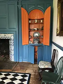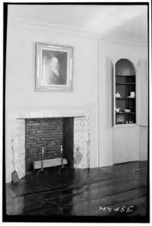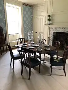The dining room is in the eastern wing, separated from the eastern parlor by the rear hall,[190] and is designed in a late-18th-century style. It was likely not originally used for meals, as Americans generally did not have dedicated dining rooms prior to the American Revolution.[181] The dining room had a fireplace with a mantel from c.1800,[171] which had ornamentation such as pilasters, sunbursts, and motifs of one-quarter of a fan.[181] There was a small closet built into the side of the fireplace mantel, which was used to keep items warm during winters. One corner of the room also featured a large white cupboard which was used to store porcelain.[191] The walls are made of light plaster above dark buff wainscoting, and a chimney occupies the north wall. Atop the wall was a ceiling molding, which likely dated from the 19th century.[181] An 18th-century ceiling molding and fireplace mantel were restored in a subsequent renovation.[192]