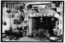 The kitchen is within the raised basement.[158] The walls of the basement are 3 feet (0.91 m) thick, a defensive measure,[179][180] and are made of plaster on stone.[181] There are two small windows near the top of the western wall, which may have been intended as defensive loopholes.[179][182] The basement's ceiling has low wooden beams,[181] which measure 11 by 13 inches (280 by 330 mm)[179][183] and were hand-crafted out of cypress and cedar.[180] Water for the kitchen was originally sourced from Vault Hill.[12] There is a Dutch brick oven embedded in the kitchen's wall.[181][180] On one wall is a wide, short fireplace with a hearth and an arched opening.[181] A dresser and a porcelain closet occupied the kitchen.[182] There is also a newer basement with a classroom[158] and an auditorium.[151] The museum's restrooms are also in the basement.[184]