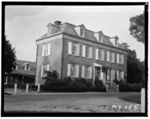 The house, designed by an unknown architect,[170] is built in the Georgian style and is 2+12 stories tall.[171][172] It was reportedly based off Philipse Manor in Westchester County.[60][100][173] The house has an L-shaped plan, with wings extending along the south and east sides.[158][171] The southern wing was probably completed first, followed by the eastern wing.[158] A lean-to was added to the house in the 19th century,[174] while a caretaker's apartment (adjacent to the main house) dates to before World War I.[158][129]
