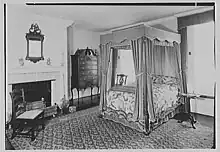 When the house opened a museum, the western parlor was set aside specifically as a museum, while the other rooms displayed memorabilia from Colonial Dames and their friends.[77] In the house's early years, one room contained artifacts from the colonial and Revolutionary War eras.[180] Old-fashioned cookware was exhibited in the kitchen.[12][182] The western parlor had a pair of Benjamin Franklin's andirons and some maps dating as far back as 1642.[200] In the eastern parlor were furniture such as chairs, a writing desk, a candle stand, and four chalk artworks.[186] The dining room displayed porcelain, platters, and a dinner table.[12][201] The western bedroom on the second story featured furniture from Washington's time at the house, such as his bed, a mahogany footrest, a carved clock, and bed steps. The eastern bedroom had a chest, printing press, and cradle, while the spinning room featured several tools used for needlework.[195] Other objects displayed throughout the house included a set of wooden vultures that once belonged to a Spanish privateer,[73][183] and two cannons outside the entrance.[7][124]