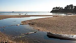 On the ocean side of the highway, a free parking lot provides access to Little River Beach at the mouth of the Little River, also part of the park. The waters offshore from the beach form the Van Damme State Marine Conservation Area.[2] The beach also serves as the launch site for kayak tours of the sea caves in the area.[3]
