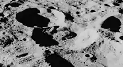 Oblique Apollo 16 image, facing north. Van Gent at center, Van Gent X in upper left.
