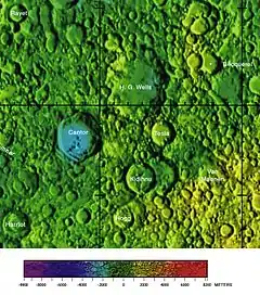 Van Maanen is an eroded lunar impact crater on the far side of the Moon. It lies to the east of the crater Kidinnu, and southeast of Tesla and H. G. Wells. Since this crater was formed, it has been heavily battered by subsequent impacts to the point where it is little more than a depression in the surface surrounded by an irregular rim. The rim edge is heavily worn and poorly defined, with smaller craters lying along the sides. These in turn have become worn and rounded.