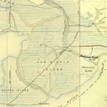 The island, historically, was referred to by a number of names, including "Jones Island", "Van Sickle Island", "Van Sickles Island" and "Van Sickle's Island".[1] It is shown as "Jones Island" on an 1850 survey map of the San Francisco Bay area made by Cadwalader Ringgold,[13] as well as an 1854 map made by Henry Lange.[14] However, an 1891 decision by the Board on Geographic Names Decisions established its name as Van Sickle Island.[1]