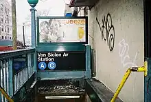 Construction resumed on the extension of the Fulton Street Line in November 1946,[10][11] following the conclusion of the war and the allocation of funds obtained by Mayor William O'Dwyer.[12][6] After several test runs, the station opened to the public in the early morning of November 28, 1948, along with the rest of the line to Euclid Avenue.[5][13] The cost of the extension was about $46.5 million.[6][14] Because Van Siclen Avenue and three other stations were completed later than the rest of the line, they received different design features than other IND stations, including different wall tiles and fluorescent lighting.[6][5][15] It later became the replacement for the elevated BMT Fulton Street Line's Van Siclen Avenue station, which closed on April 26, 1956 when the connection to the eastern Fulton elevated was opened.[7][16]