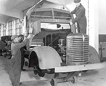 The original factory building, officially a warehouse and assembly hall, had a volume of 25,000 m3 (33,000 cu yd).[8] The facilities were developed over time and by the end of 1953, the floor area was 35,000 m2 (42,000 sq yd). The warehouse and assembly hall were renamed the main hall; it was now 120 m (130 yd) long and 30 m (33 yd) wide. Bus chassis production was located at the southern side of the hall and lorries were built at the northern side. This set-up was often changed depending on the product mix and production volume.[39]