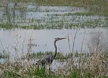 Vancouver Lake is home to a variety of wildlife species, many of which it shares with the nearby Ridgefield National Wildlife Refuge. Descriptions from the late 19th century describe Vancouver Lake as clear, up to 20 ft (6.1 m) deep and containing sturgeon. Current turbidity, more shallow depths and a lack of aquatic plant structures have diminished the variety of species and more recent surveys showed the most abundant fish by mass were brown bullhead, white crappie, black crappie, and common carp, with a few juvenile salmonids and a population of channel catfish, largemouth bass, bluegill, pumpkinseed, yellow perch, naturalized goldfish, northern pikeminnow, American shad, mosquito fish, largescale sucker, and freshwater sculpin.[5][6] Rich fringe environments provide habitat for amphibians such as tree frogs, reptiles such as garter snakes and a wide variety of birds, including large species such as great blue herons, osprey and bald eagles. It is within the Pacific Flyway. Large mammals on its banks include raccoons, a few black-tailed deer and an occasional coyote.