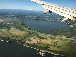 ![]() An aerial view of the lake (with the Columbia River in the foreground) | |