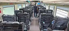 The train has two seating options, Chair Car and Executive Chair Car. The coaches are air-conditioned and feature airline-style seats in a 2-3 configuration in Chair Cars and 2-2 Configuration in Executive Chair Cars. The service offers onboard catering with both vegetarian and non-vegetarian meal options included in the fare as standard. The biggest improvement of Vande Bharat services is the fully sealed gangway (locally called Vestibules or inter-coach pathways) that will keep of dust and noise outside and the semi-permanent couplers that will ensure smooth bang-less travel experience to passengers.