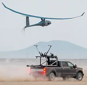 The initial VA001 was powered by a off-the-shelf engine driving a pusher propeller, and was controlled by a Piccolo autopilot.[1] Weighing up to 600 lb (272 kg), it has a 36 ft (11 m) wing span and a 55-gallon (208-litre) fuel capacity.[1] It has a projected endurance of up to 10 days at 55 kn (102 km/h) and up to 15,000 ft (4,600 m), and burning 1 lb (450 g) of jet fuel per hour.[1] The VA001 was launched using a sled and pulled by a towline attached to a pickup truck. It lands at 40 kn (74 km/h) on a single center wheel.[1] The Vanilla UAV uses a pickup truck launcher for takeoff.