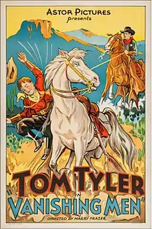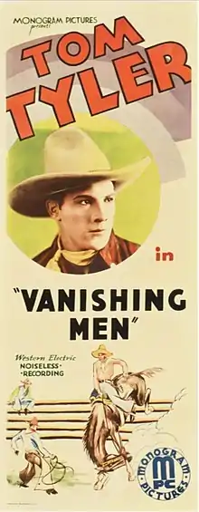 In 1931, the newly formed Monogram Pictures announced the titles of its first 28 films, to be produced and released over the following year, including eight Westerns starring Tom Tyler.[lower-alpha 2][4][5] Vanishing Men was released in the United States on April 15, 1932,[1] and in the UK on June 3.[6] In 1937, the film was re-released by Astor Pictures.[1]