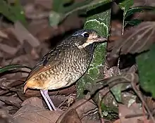 The variegated antpitta was described by the French polymath Georges-Louis Leclerc, Comte de Buffon in 1780 in his Histoire Naturelle des Oiseaux from a specimen collected in Cayenne, French Guiana.[2] The bird was also illustrated in a hand-coloured plate engraved by François-Nicolas Martinet in the Planches Enluminées D'Histoire Naturelle which was produced under the supervision of Edme-Louis Daubenton to accompany Buffon's text.[3] Neither the plate caption nor Buffon's description included a scientific name but in 1783 the Dutch naturalist Pieter Boddaert coined the binomial name Formicarius varius in his catalogue of the Planches Enluminées.[4] The variegated antpitta is now placed in the genus Grallaria that was introduced by the French ornithologist Louis Pierre Vieillot in 1816.[5][6] The genus name is from Neo-Latin grallarius meaning "stilt-walker". The specific epithet varia is from Latin varius meaning "various", "diverse" or "variegated".[7]
